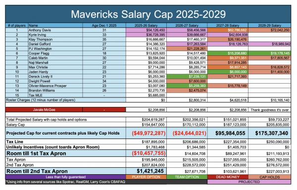 RE: MAVS NEWS: - ThisIStheYear - 06-24-2025 (06-24-2025, 08:47 PM)SleepingHero Wrote: Tier 1: Chris Paul, D’Angelo Russell 100% agree on tier 1. Would pass on the other two, but if I had to choose, though Brogdon is the better player, he’s going to spend the majority of the season in street clothes. Would prefer Paul over DLo. RE: MAVS NEWS: - cow - 06-24-2025 (06-24-2025, 10:13 PM)Chicagojk Wrote: Even at his advanced age, he could be a nice stop gap starter He played 82 games last season to boot. Could someone please update my tag with?: CP3 or off with Nico's Head RE: MAVS NEWS: - Smitty - 06-24-2025 @CBAMavs NEW PINNED TWEET - Added Kyrie/Gaff's Reported Deal/Extension - Added a placeholder for the full Tax MLE After using Tax MLE - Amount ABOVE 1st Apron $10,457,755 - Amount BELOW 2nd Apron $1,421,245 [No hard cap triggered yet] As usual: Some nuance is simplified RE: MAVS NEWS: - Smitty - 06-24-2025 Report: Expect Kai Jones to return to the Mavericks on a standard NBA deal, per @Ary_Report This guy was the first one with the Kyrie news fwiw RE: MAVS NEWS: - myconsumerclub - 06-24-2025 Now if we can add to that sum and do so by trading off guys on our team we would like to trade off, ie Powell, Martin, and Hardy. That would free up an additional sum of 19.5 Million that might get divied up over some more players we might want try and acquire. You got your 10 man core of Cooper, AD, Irving, PJ, Lively as the starters and bench is BWill, Naji, Gafford, Max, Klay and the 11th guy is Omax. You do what you can to add in a PG with that extra cash we got thanks to Kyrie, and that is 12. But wait you got to have more guys on the team than that, hence the reason for that trade off of our three unfortunates. I think with what you have left you can add Kai Jones, and a 2nd rounder and a few rookies for 2 ways. Oklahoma has a lot of guys they may cut that we can choose from. From the sound of things we might find a lot of good guys getting let go all over the league and get some useful veterans who want to play still. RE: MAVS NEWS: - OBX Maverick - 06-24-2025 And then there were two… Report: The Mavs have narrowed their PG search down to D'Angelo Russell and Malcolm Brogdon. They want to sign one of these PGs with their MLE, per Shams RE: MAVS NEWS: - ThisIStheYear - 06-24-2025 This second apron era seems like the opposite of the year every team suddenly had max cap space and the Warriors were able to sign KD. A few teams that know what they’re doing are going to set themselves up for a few years. And DLo would be a pretty good pickup. RE: MAVS NEWS: - myconsumerclub - 06-24-2025 https://athlonsports.com/nba/dallas-mavericks/mavericks-kai-jones-making-case-standard-nba-deal Mavericks’ Kai Jones Making Case for Standard NBA Deal With Late-Season Impact RE: MAVS NEWS: - F Gump - 06-24-2025 (06-24-2025, 09:39 PM)Smitty Wrote: This is the contract with the lowest Kyrie can make this year. That's making the assumption there are no incentives included in the 119M total. I'm wondering if that's a good assumption. When the last deal with the Mavs/Kyrie was leaked, with same GM, same agent, and Kyrie, the leaked number actually included some incentives in the total. For example, if he's getting 1.5M in incentives each year, then his salary may be starting at around 35M, not 36.7. RE: MAVS NEWS: - Scott41theMavs - 06-24-2025 (06-24-2025, 10:51 PM)OBX Maverick Wrote: And then there were two… I'm not sure if I'm more elated that Schroeder is off the list or annoyed that CP3 is. RE: MAVS NEWS: - F Gump - 06-24-2025 (06-24-2025, 10:36 PM)Smitty Wrote: Report: Expect Kai Jones to return to the Mavericks on a standard NBA deal, per @Ary_Report I've been advocating for this for about 2 months --- but there's info missing. How? Assuming they plan to add a PG with the TxMLE as advertised, the 15-man roster is full. They already have 3 C's, not including AD. Gotta be doing some sort of trade to open up a reason and a space for Kai to be signed. And do they also have Exum on their radar PLUS a PG with the MLE? Roster space is way overbooked, it seems. RE: MAVS NEWS: - Scott41theMavs - 06-24-2025 (06-24-2025, 10:36 PM)Smitty Wrote: Report: Expect Kai Jones to return to the Mavericks on a standard NBA deal, per @Ary_Report Wonder how that affects the cap. Hopefully it's vet min. It also strikes me, evidently you can never have too many bigs. Considering AD has to have some minutes at center, whether he likes it or not (unless Steph wants to take some of his summer free time teaching him how to shoot), someone's got to be outgoing. RE: MAVS NEWS: - StrandedOnBeauboisHill - 06-24-2025 It’s weird to feel weird about watching the front office navigate this offseason well. Could literally just draft Flagg, sign D’Lo (not a fan but you could do a lot worse given the situation) and extend PJ to a fair but tradeable contract like Gafford and the offseason will have been solid. Was certain they’d have to trade someone for a guard but now that’s not even that necessary. RE: MAVS NEWS: - Mavs2021 - 06-25-2025 CP3 is 40 years old. Mavs need a guard that can carry 30 MPG easily for six months. Russell and Schroeder make the most sense in that situation. Plus he´s a minimum guy, nothing more. A potential trade of Hardy, Powell, Martin gets you to Sexton. Also we can just trade a future 1st, if we really like a guard in this draft. What good will the Lakers 2029 pick be, if we want somebody on the same timeline as Flagg? They love Denim, Traore or somebody else, just get them. There is no need to give up players. RE: MAVS NEWS: - cow - 06-25-2025 (06-25-2025, 12:47 AM)Mavs2021 Wrote: Also we can just trade a future 1st RE: MAVS NEWS: - Knutsen - 06-25-2025 (06-24-2025, 11:22 PM)Scott41theMavs Wrote: I'm not sure if I'm more elated that Schroeder is off the list or annoyed that CP3 is. Why the hate for Schroeder? RE: MAVS NEWS: - FireNicoHarrison - 06-25-2025 (06-24-2025, 08:11 PM)DanSchwartzgan Wrote: Kyrie op