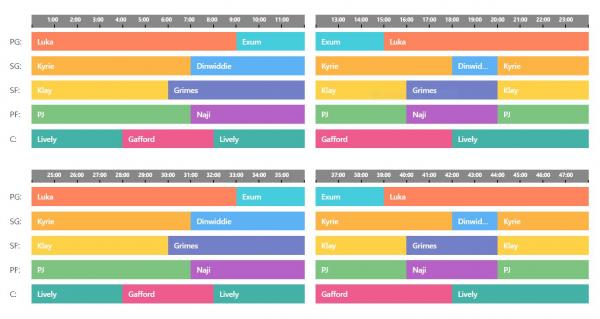 This is very tough. In reality Naji will probably not see the floor for 27 minutes. Lively will probably get a bit higher than 25. Grimes+Hardy+Dinwiddie will be a battle on who is the best for the job because there is a tight squeeze.