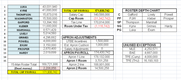 The numbers with Lawson waived, showing the lack of room for 2 minimum salaries (2.1M each).